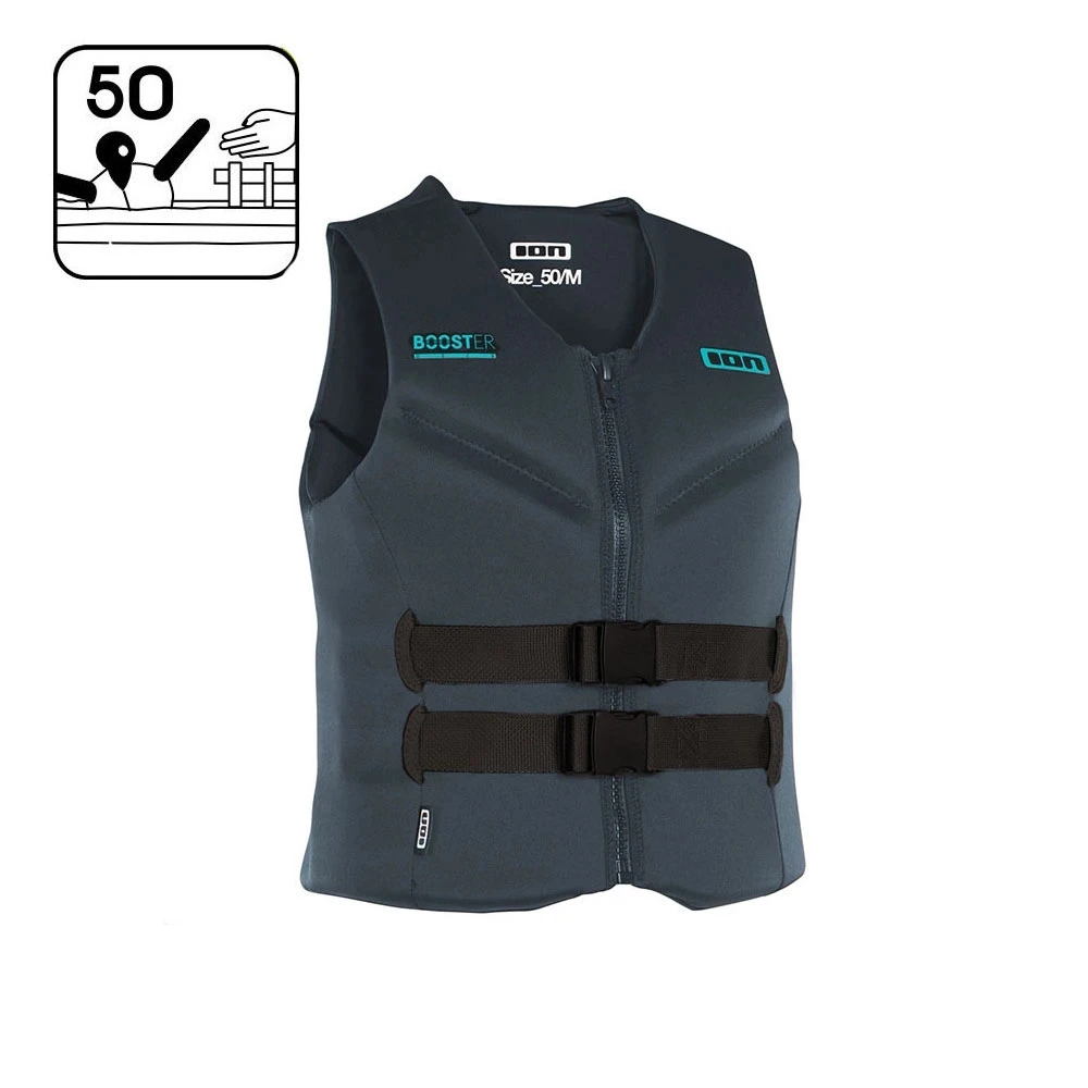 Spécialement conçu pour pouvoir porter un harnais de kitesurf ou de windsurf afin de se protéger également en navigation, le gilet de flottabilité ION Booster 50N FZ est homologué double action. Il offre à la fois une véritable flottabilité homologuée de 50 Newton ainsi qu’une protection du haut du corps lors des chutes.