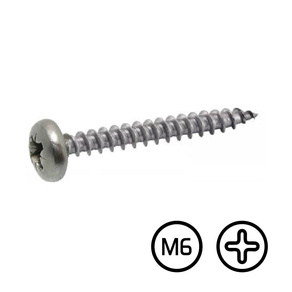 Vis autotaraudeuse M6 cruciforme à tête cylindrique permettant de fixer des footstraps. Visserie de haute qualité spécialement conçue pour une utilisation marine.